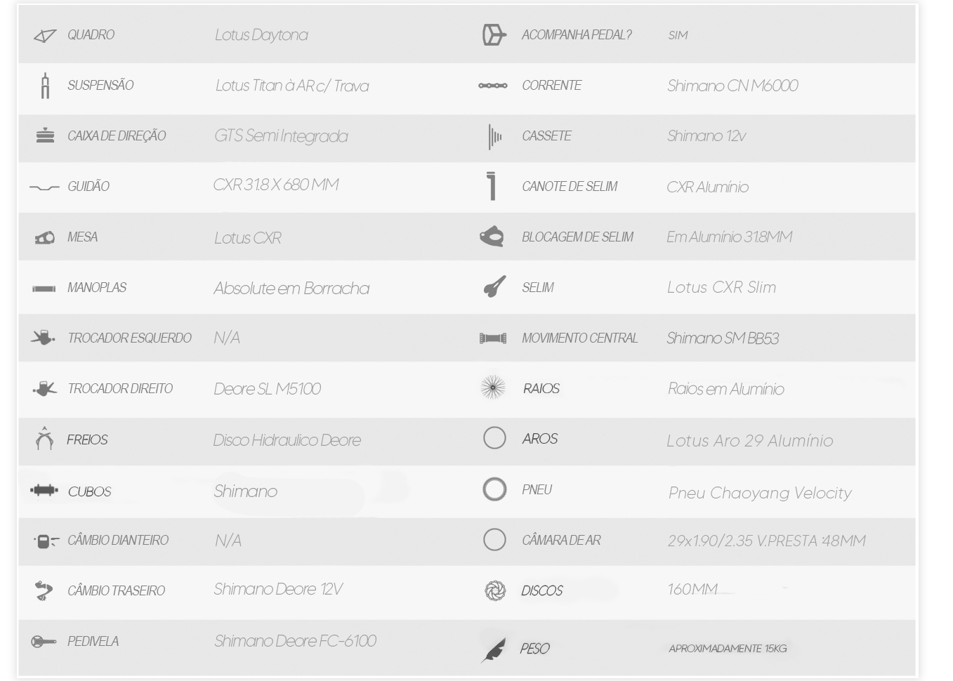 A Bicicleta Lotus Daytona Deore, também conta com um sistema de freios de alto desempenho para garantir que todo o conjunto da bicicleta possa oferecer mais segurança, para isso ela utiliza componentes Shimano Deore em seus freios.