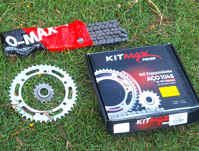 - Contém: 01 Pinhão 15D, 01 Coroa 46D, 01 Corrente 428H.
