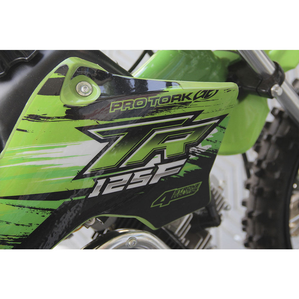 A Mini Motocicleta Cross Pro Tork TR125F possui um design inovador através dos desenhos do seu Kit Plástico, sendo desenvolvida para pilotagem de crianças com a partir de 5 anos de idade, contando com um motor 4 tempos de 125cc, proporcionando melhor desempenho e performance em provas e competições transformando tudo isso em ótimos resultados. Seu sistema de partida é através de pedal e seu quadro em aço permite resistência a terrenos irregulares. Para maior conforto e absorção de impactos sua suspensão dianteira é modelo telescópica e a traseira Monoshock e seus sistemas de freio à disco permitem maior segurança ao realizar seus percursos. Seu sistema de transmissão conta com um câmbio de 4 marchas e suas rodas traseira e dianteira são no tamanho de 12 polegadas.