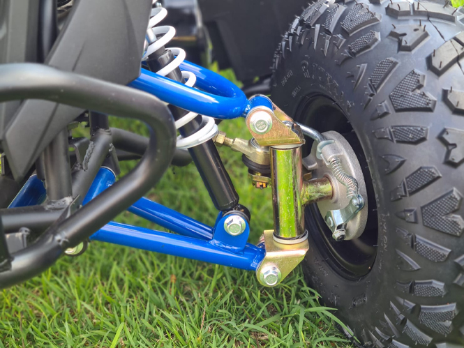 Essa suspensão além de extremamente funcional, traz para o Thor 90cc um visual diferenciado e uma boa altura do solo, para evitar que objetos como galhos e pedras sejam um obstáculo, e consegue suportar até 60kg de carga.